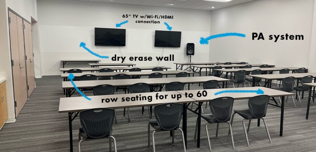 Community room – classroom seating for 48 people and row seating for 60 (max. capacity of 102). This room is best for larger events and features a serving area with a sink.